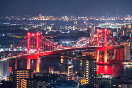 Wakato red bridge light up and modern city at night, Kitakyushu, Fukuoka, Japan. Travel destination to view aerial cityscape from Takatoyama Observation Deck.