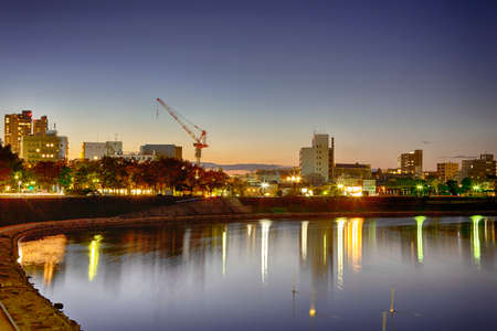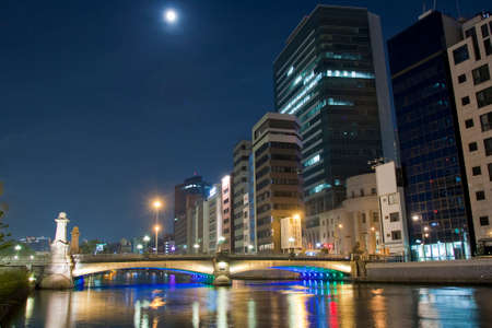 Canal at sunset with buildings reflected in the water, Fukuoka, Japan