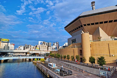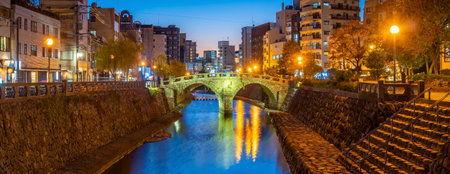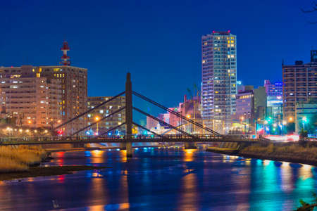 Fukuoka old town along naka river at Nakasukawabata sunset twilight. This area is favorite for tourist for Fukuoka Yatai, street Food stall, for hangout at night.