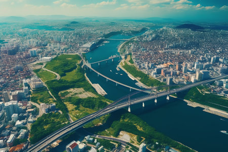 Generative AI : Aerial view of the tortuous Annai Bridge on the Takaosan IC highway Tokyo Japan