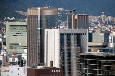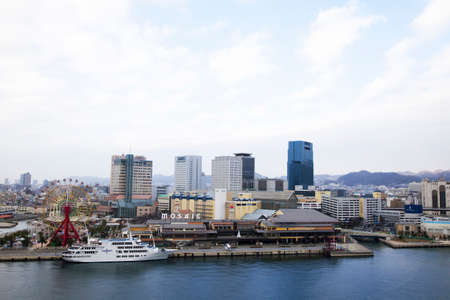 Kobe / Japan - October 8, 2017: Kobe city skyline with Kobe port and Osaka bay in the distance in Kobe Japan