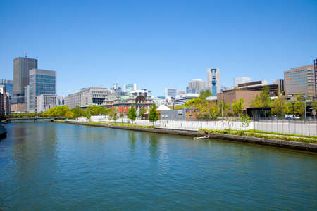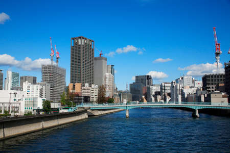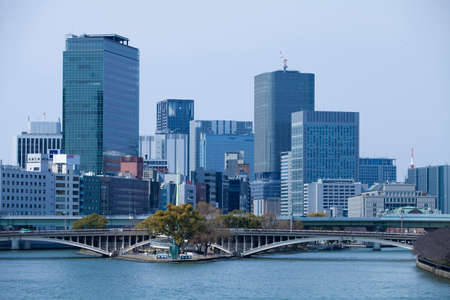 Japan. Osaka. Coast of the Osaka Gulf top view. Osaka city on the background of the bay. Cities of Japan. Bridges in the Japanese city. Skyscrapers on the Gulf. Japan Travel Guide. coast of east asia
