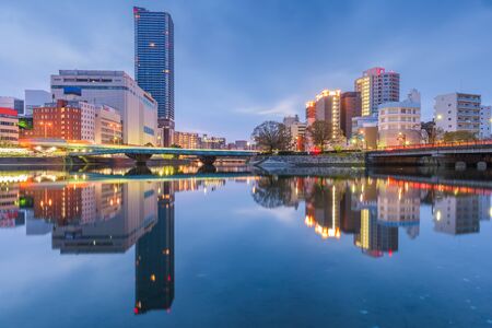 Hiroshima, Japan downtown cityscape on the Enko River at twilight.