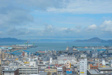 Kanazawa, Japan - 29 Sep 2019 : Aerial view of Kanazawa industrial port harbor with Kanazawa city in the background