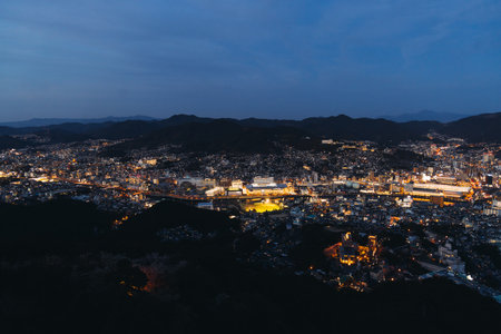 Nagasaki night panorama, Japan, aerial view, city skyline, port and mountains, seen from Inasa mount, Inasayama park, city illumination, Nagasaki prefecture, Kyushu island region, ropeway cable car