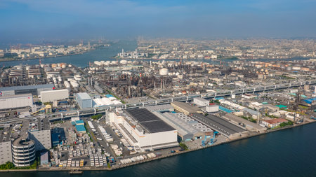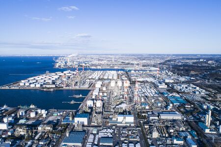 Aerial view of petrochemical oil refinery and sea in industrial engineering concept in Shizuoka district, urban city, Japan. Oil and gas tanks pipelines in industry. Modern metal factory.