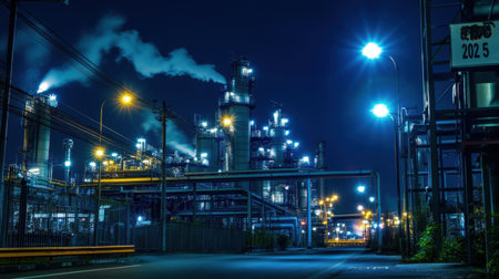 The industrial plant features towering structures and smoke stacks illuminated by bright street lights under a dark night sky.