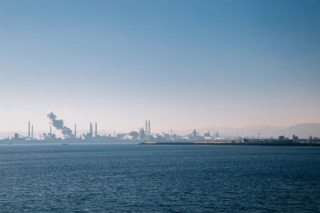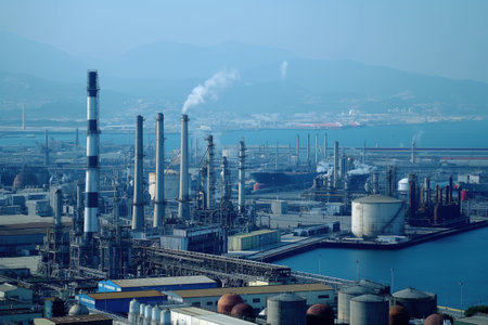 Industrial landscape showing an oil refinery emitting smoke with cargo ships docked at the port in a coastal city