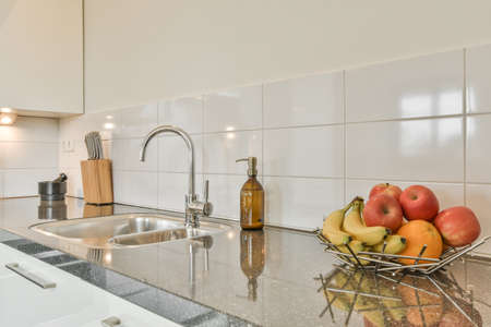 A kitchen sink with a faucet and a bowl of fruit on the countertop, surrounded by cabinetry and a rectangle-shaped plumbing fixture. Interior design with a touch of freshness