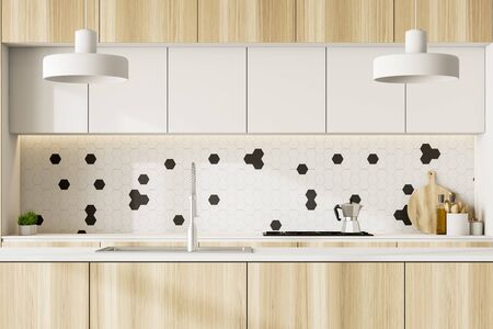 Trendy white kitchen interior with elegant wooden cupboards and kitchen accessories