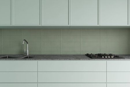 Close up of green countertops with built in sink and cooker standing in stylish kitchen with green walls and cupboards. 3d rendering