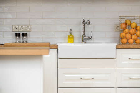 Cropped view of modern kitchen in white tones with white surface, black sink and decor. Cozy place for cooking. luxury cuisine interior design