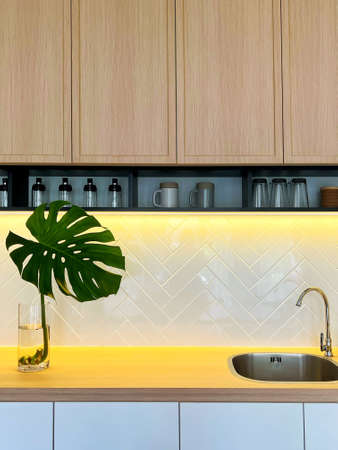 Stylish kitchen interior design in modern apartment with workspace with wooden kitchen accessories. Creative walls. Minimalistic style and plant love concept. Details.