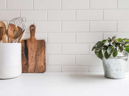 Stylish white kitchen background with kitchen utensils and green houseplant standing on white countertop, copy space for text, front view