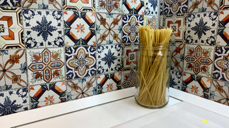 Kitchen interior with colorful ceramic tiles on the wall. Toned.