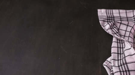 Red plaid checkered kitchen textile on black background, blackboard or old chalkboard. Top view, copy space for text