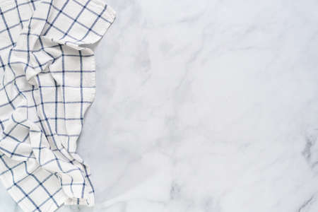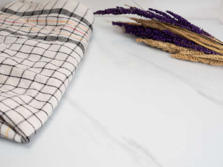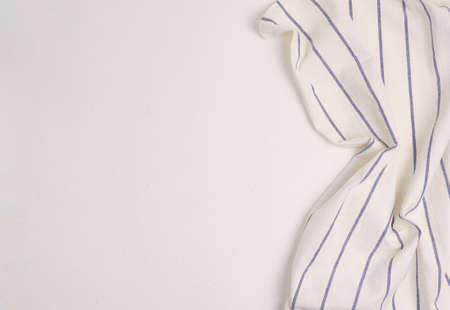 Stripped vintage towel on white concrete background with copy space as a cooking concept
