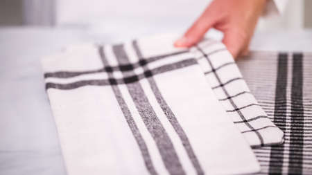 Chores indoors. Hands of a woman folding colorful kitchen towels on a white table near a light blue spray. Cleaning products. House work. Cleaning activities indoors in time of coranavirus disease.