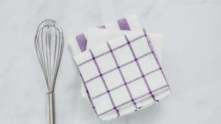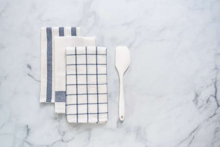 Tableware, material or cloth concept - Kitchen textile on chic white marble background, napkin and towel set, folded fabrics as food styling props for luxury home decor brand, interior design
