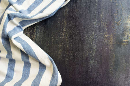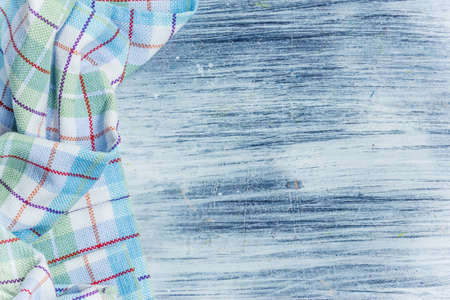 Kitchen towel or napkin over the rustic wooden table. View from above with copy space