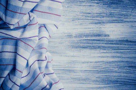 Top view kitchen dishtowels on the blue planks background.