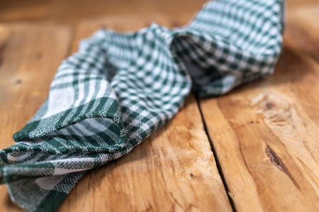 A green checkered kitchen towel lies on the countertop of a wooden table. Crumpled Towel or kitchen napkin on rough boards. selective focus.