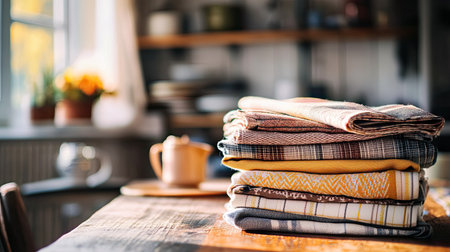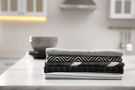 Stack of soft kitchen towels on white table indoors