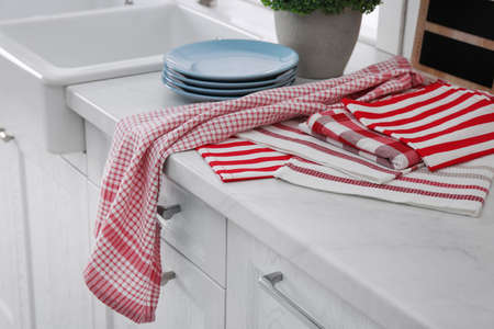 Different towels and stack of plates near sink on kitchen counter