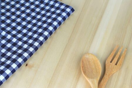 Wooden table covered with tablecloth cloth checkere and wooden spoon