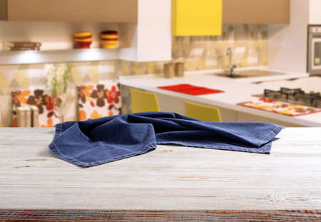 Napkin on wooden desk perspective. Kitchen background selective focus.