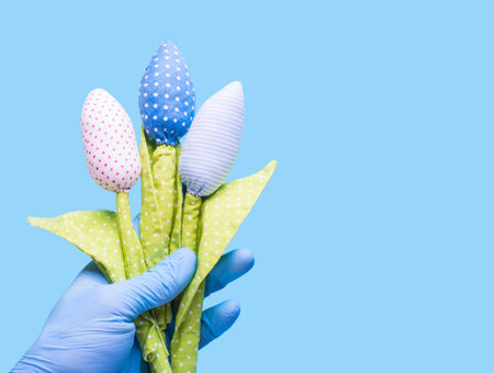 Hand in glove holding flowers made of fabric. Anti-allergic flowers. Blue background