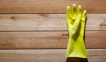 a yellow rubber wiping glove on a wooden floor. texture, wallpaper.