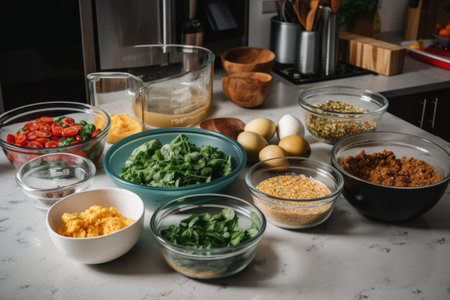 meal prep session with bowls, measuring cups, and ingredients in view, created with generative ai