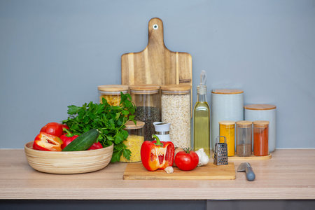 Healthy food ingredients on table in modern kitchen. Healthy eating concept