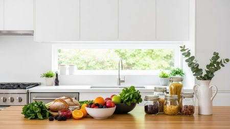 A well-lit kitchen showcases an assortment of fresh produce and ingredients. The image presents a clean aesthetic with white cabinetry and a large window. A wooden countertop displays various fruits, vegetables, and pantry staples. The scene is suitable for illustrating culinary themes or healthy eating.