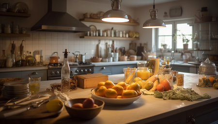 a kitchen, with a countertop filled with fresh fruits and vegetables, ready for cooking, created with generative ai