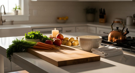 A cozy, sunlit kitchen scene featuring fresh carrots, apples, and potatoes on a wooden cutting board. A copper kettle sits on the stove in the background, evoking a warm and homey atmosphere of meal preparation.