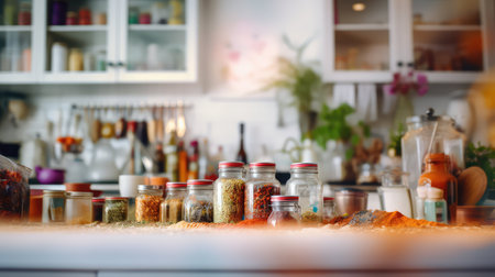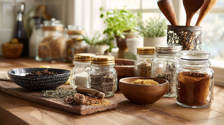 Bright and inviting kitchen scene featuring fresh herbs and spices in jars, essential utensils, and a vibrant atmosphere perfect for culinary creativity and meal preparation.