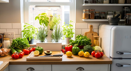 A vibrant kitchen scene featuring fresh herbs and colorful vegetables, showcasing a blend of modern design and natural elements for culinary inspiration.