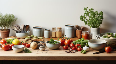 Fresh healthy meal preparation in modern rustic kitchen with organic ingredients generated by artificial intelligence