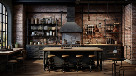 Generative AI An intricately detailed image of a high-end industrial-style kitchen with exposed brick walls and industrial lighting