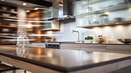 modern blurred cozy interior home illustration sleek kitchen, marble countertops, appliances background modern blurred cozy interior home