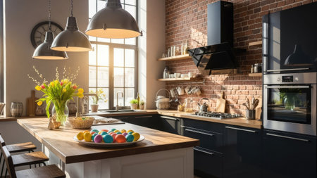 Background image of graphic kitchen interior with loft design elements, copy space