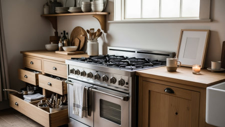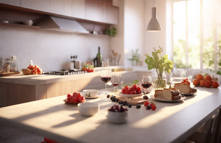 A kitchen with ingredients arranged harmoniously on AI generated illustration
