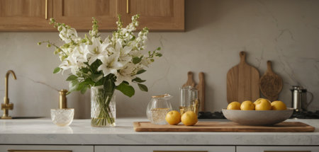 Lemon and white flowers in vase on countertop in modern kitchen