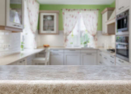 Empty marble countertop in modern kitchen interior for product display montage