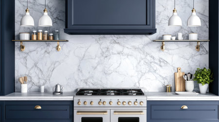3D rendering of a navy blue kitchen with a white marble backsplash and a gold sink faucet. The stove is stainless steel, there's an empty shelf above the oven, and hanging lights from the ceiling. --chaos 30 --ar 16:9 --v 6.1 Job ID: b44f0884-3899-4804-99e4-170e514de8a7
