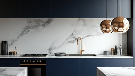 3D rendering of a navy blue kitchen with a white marble backsplash and a gold faucet, and a marble countertop. A black stove with silver metallic features. A vintage lamp hanging above the island. --chaos 30 --ar 16:9 --v 6.1 Job ID: 18794443-6b02-4cab-9bb5-4be1f03cf8ad