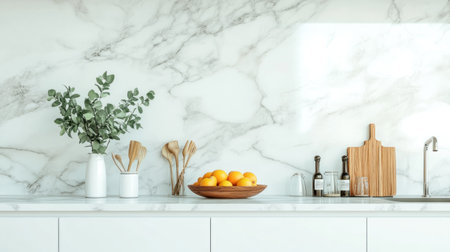 A white kitchen with a minimalist design, featuring sleek cabinets and marble countertops. The focus is on the countertop, where there's an array of fresh fruits like oranges and limes in a bowl, surrounded by various utensils including wooden tools for cooking and glass cups for water. In front stands a vase holding eucalyptus leaves to add greenery to the space. A sink hangs above the countertop, adding functionality without replicating any busy patterns or designs. --chaos 30 --ar 16:9 --v 6.1 Job ID: 6895d796-79bd-430b-a6ab-f21eeb82942c