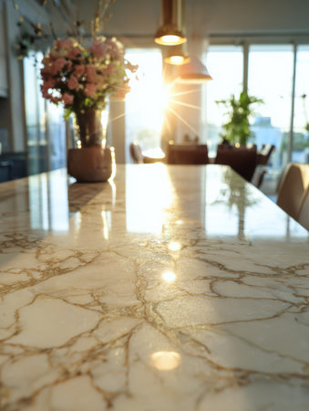 Sunlight streams through windows, highlighting a marble countertop and a vase of flowers in a cheerful kitchen setting.